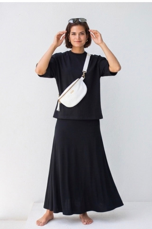 A classic longer-length skirt with a fold-over waist, making it perfect for loungewear and pregnancy!