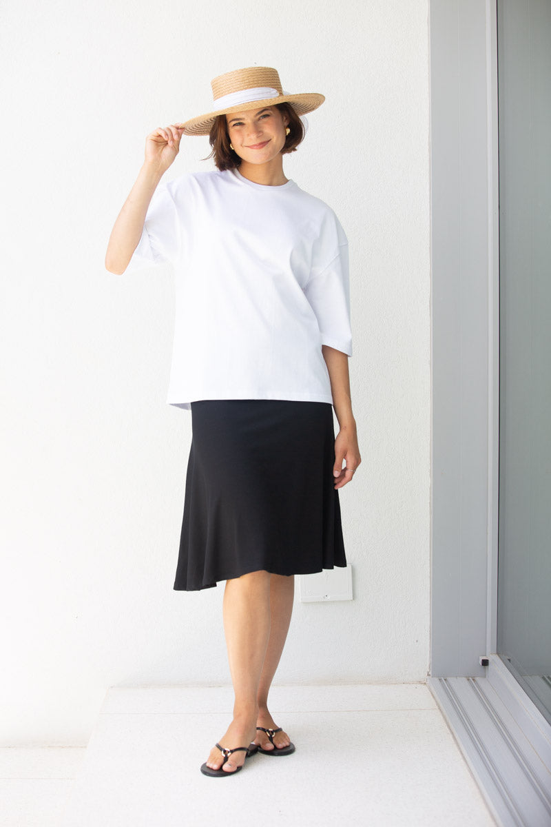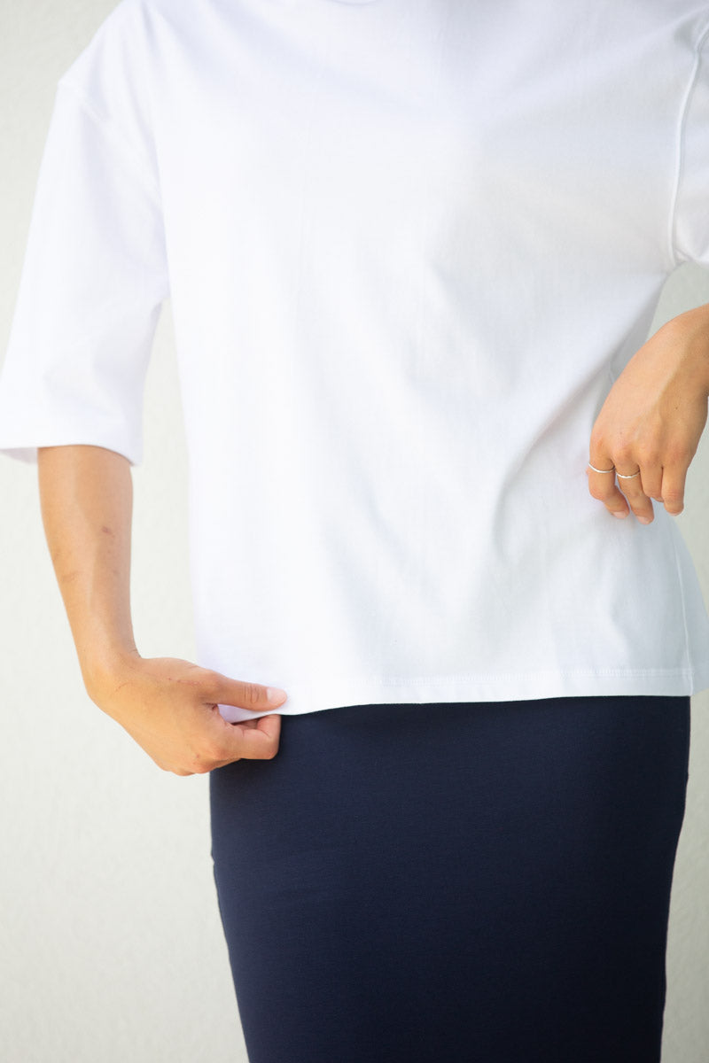 Elevate your everyday style with this effortlessly chic oversized white top. Designed with a relaxed, boxy silhouette, it offers all-day comfort without compromising on style. The dropped shoulders and wide sleeves create a modern, laid-back look, while the crisp white fabric keeps it fresh and versatile. Perfect for pairing with any of our skirts or denim, this wardrobe staple transitions seamlessly from casual outings to relaxed weekend wear.